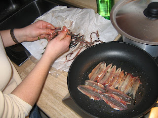 The man at the fish market insisted on cleaning the calamari for me, so I don't have a before picture. He cleaned out the inside, scraped off the thin outer skin, and cut into pieces.